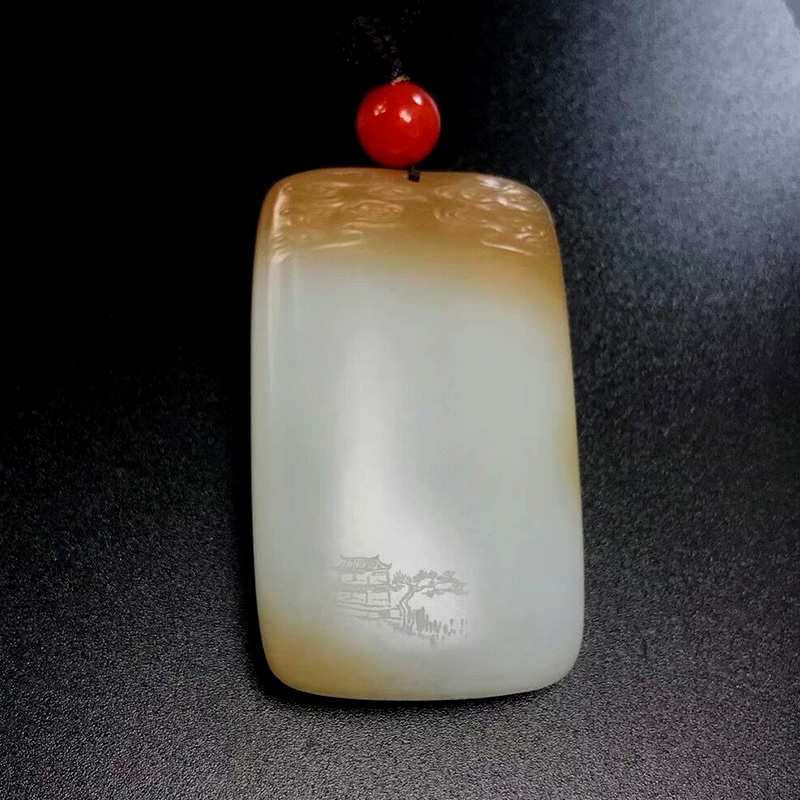 陈小林先生玉雕作品。作品以白玉为之,温润的玉质,牌边倒圆,握于掌中,舒适细腻,牌额氧化糖色饰以云纹,大量留白,极简阴刻松树与亭台,背面书诗文:“高台半行云,望望高不极,草木无参差,山河同一色。” 细细一品,天然的糖白两色被创作者已想象成无限视野的山河美景了,咫尺间,云游四海。所谓:画有尽,诗无限,意境藏心间呐。