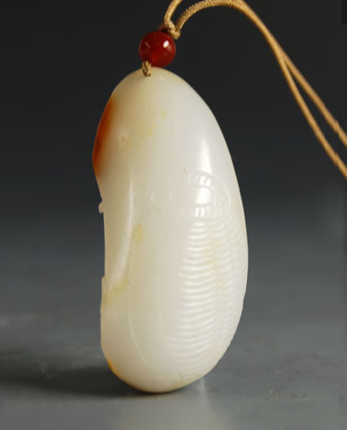 和田玉籽料挂件,玉质缜密细腻,白度中上等,独籽随形而琢,一尾金鱼在荷花与叶的掩映下,甩尾畅游,怡然自得,背面,只在微花的部分,琢成小筐,如在溪边立着的小竹篓,既巧妙避瑕,又凭添几分可人可亲的气息,不错。