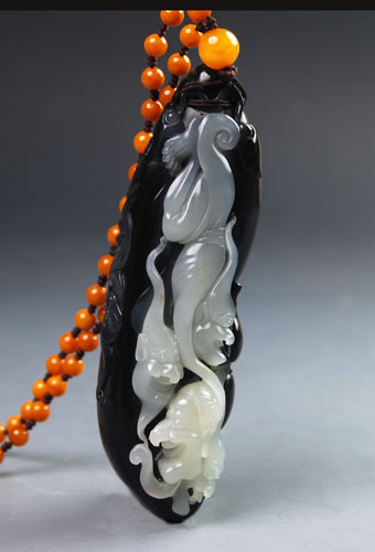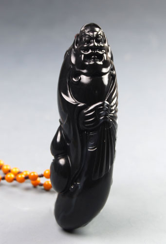 青花籽料黑白巧雕手把件。传说中的钟馗貌丑性烈,疾恶如仇。此雕件,钟馗一改传统凶貌,如英武壮士,气定神闲,似是捉鬼胜利后的小憩,透出几分儒雅,白玉部分的四小鬼,则俯首称臣,贴耳尾随,那种猥琐和轻浮之态,被表现得淋漓尽致,动感十足。玉件黑白分明,极富表现力,无愧为佳作。