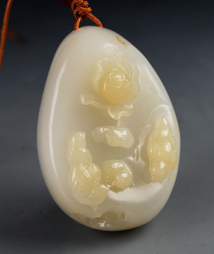 岸边,五只小鸡三两成群,窃窃私语,享受阳光,荷塘,荷花出水绽放,荷叶仰面迎天,一派和谐的田园景致。 和田玉籽料手玩件。玉质缜密细腻,白度好,一般地,籽料鲜有氧化糖色晕染,此籽料带糖,色均一,工艺师巧用糖色,高浮雕荷花和小鸡,花叶层层翻卷,稚鸡体态饱满,形态各异,充满意趣,工艺不俗!玉件既有牌的款型,又打破了牌形的规整,随料特点布局构图,有味道。背面留素满皮,也给盘玩者留下品赏美玉脂感的余地。精品。