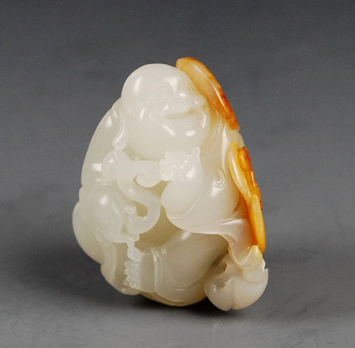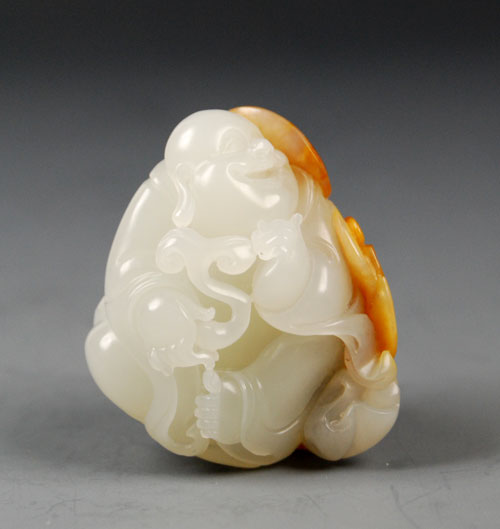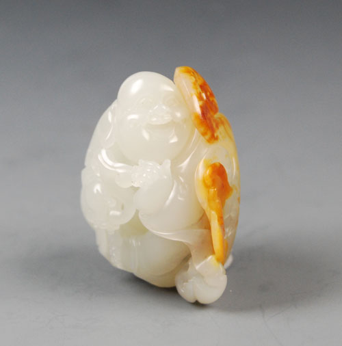 和田玉籽料小玩件。玉质细腻,油润,白度中等,背部有微花。随形而琢大肚弥勒佛,开怀而笑,手持如意,盘腿而坐,俏色如意、蝙蝠,寓意鸿福将至,小小玉件,工艺却不凡,大到衣褶袖里,小到眉眼手足,均唯妙唯肖、线条流畅,是一件不可多得的小物件。