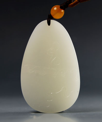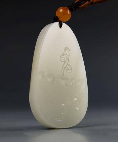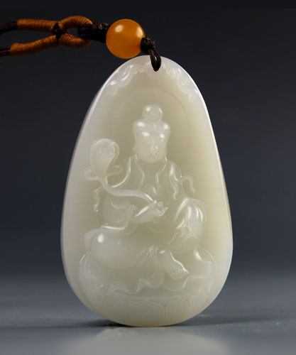 和田玉籽料玉牌。玉质缜密细腻,白度好,玉牌呈水滴型,高浮雕,观音半跌坐姿,手持莲花,发髻高盘,面容丰腴,神情庄重,普渡众生矣。背面饰以云纹和如意纹,很简洁。玉牌厚薄适宜,佩戴舒适,庇佑平安。