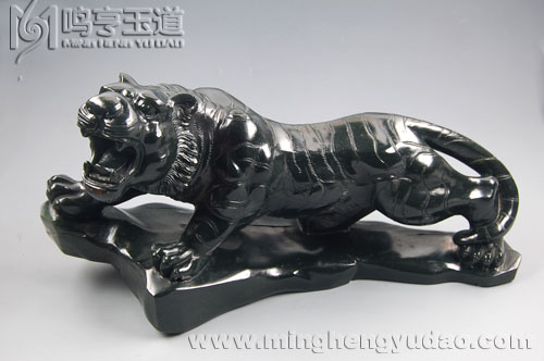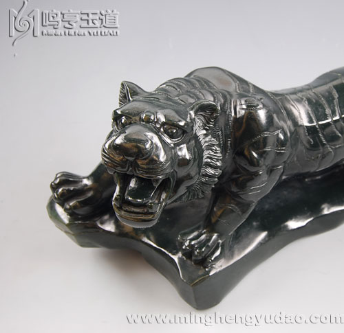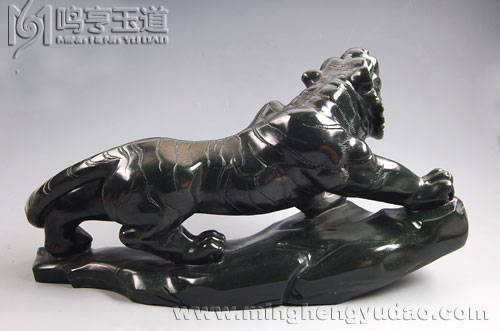 和田青玉摆件,材质致密,色呈深绿色,猛虎昂首,立于山石之上,虎步有力,四肢拔地,双目圆睁,张嘴露齿,大声咆哮状,狂生乍起,吹得脸部毛发向两边耸然,震撼山河,老虎威猛有姿,君王气质尽显,摆件工艺不错,有动感,有体有量,有气势。