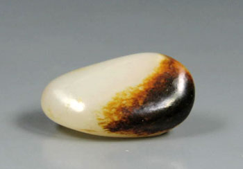 和田籽料原石,材质缜密细腻,白度上等,料子完整形似如椭圆,上下两抹浓艳的皮色,如金秋醉人的色彩,仿佛透着缕缕稻香。