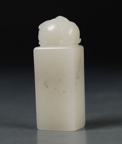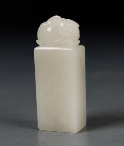 和田玉籽料印章,取青花籽料的白玉部分为之,玉质细腻,白度好,内略有墨点,印纽琢小兔团卧,小巧可爱,印身光素无纹饰,颇有爽滑的手感,玉印周正精致,取料珍贵,可把玩,也很实用。(可再刻闲章或名章)