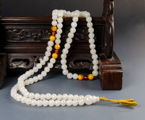 佛珠,也叫念珠,是佛教徒念佛时用以记数和束心的工具,也是修行时的一种信物。 此佛珠取材稀少珍贵的和田玉籽料,其玉质缜密细腻,白度中上等,108颗玉佛珠,同质同色,珠圆玉润,清凉净润,捻珠念佛,所谓“静虑离妄念,持珠当心上”矣。