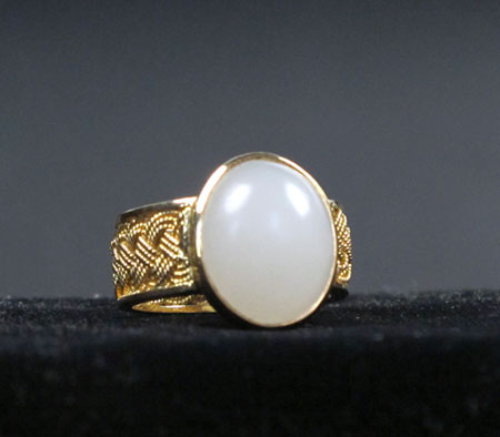 关乎盟誓的戒指,传达一种托付,一种给予,一种承诺,一种相许。 和田玉籽料琢成蛋面,18K黄金手工掐丝作环,拉丝手工编织,黄金顿时失去了金属固有的凌厉光泽,指环温润的,饱满的、镂空的质感,衬着润若凝脂、温厚的美玉,戒指透着优雅、高贵的气质。