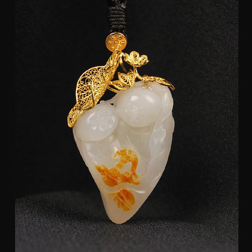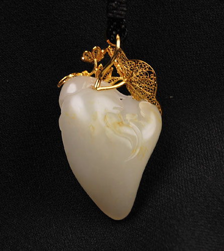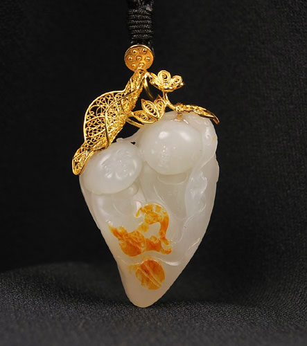他俩,坐拥花藕中,亲密无间,笑容灿烂,漾开了眉眼,金枝玉颜,象一首抒情小诗,金玉如此搭配,绝佳! 和田玉籽料金玉组合挂件,顶部,18K金花丝盘出莲叶及蓬,丝丝网中透着灵气,下部,玉件凝脂温厚,工艺细腻,整体玉件虚实相映,黄白和谐,金玉光泽柔和统一,造型如桃,不失为个性挂饰。