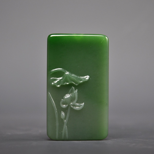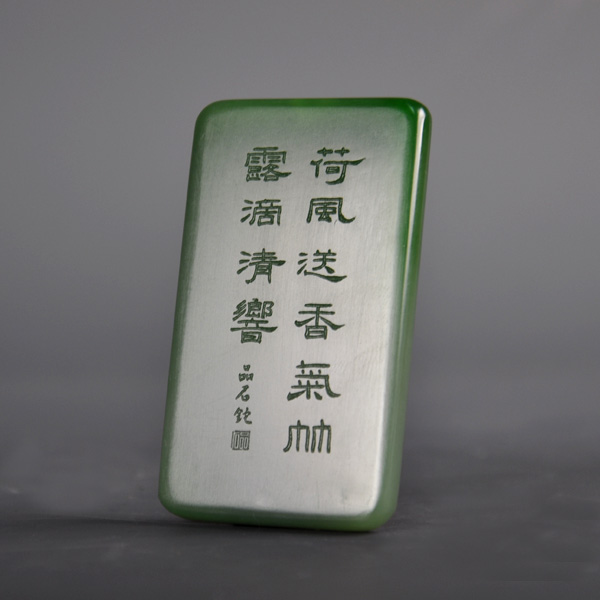 和田玉碧玉牌。清润的玉色,配上唯美的构图和诗文,诗书画融合,赏玩兼得,悦目悦心。